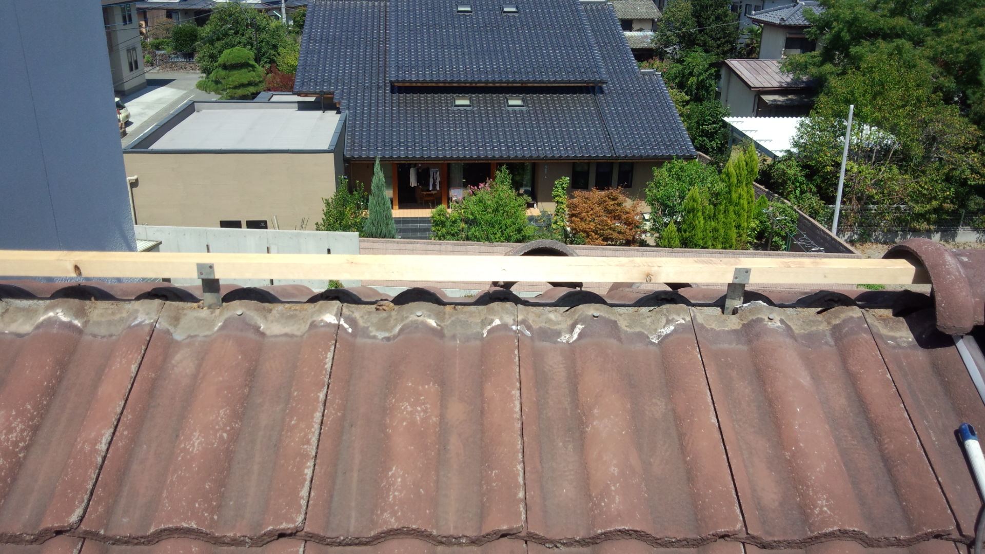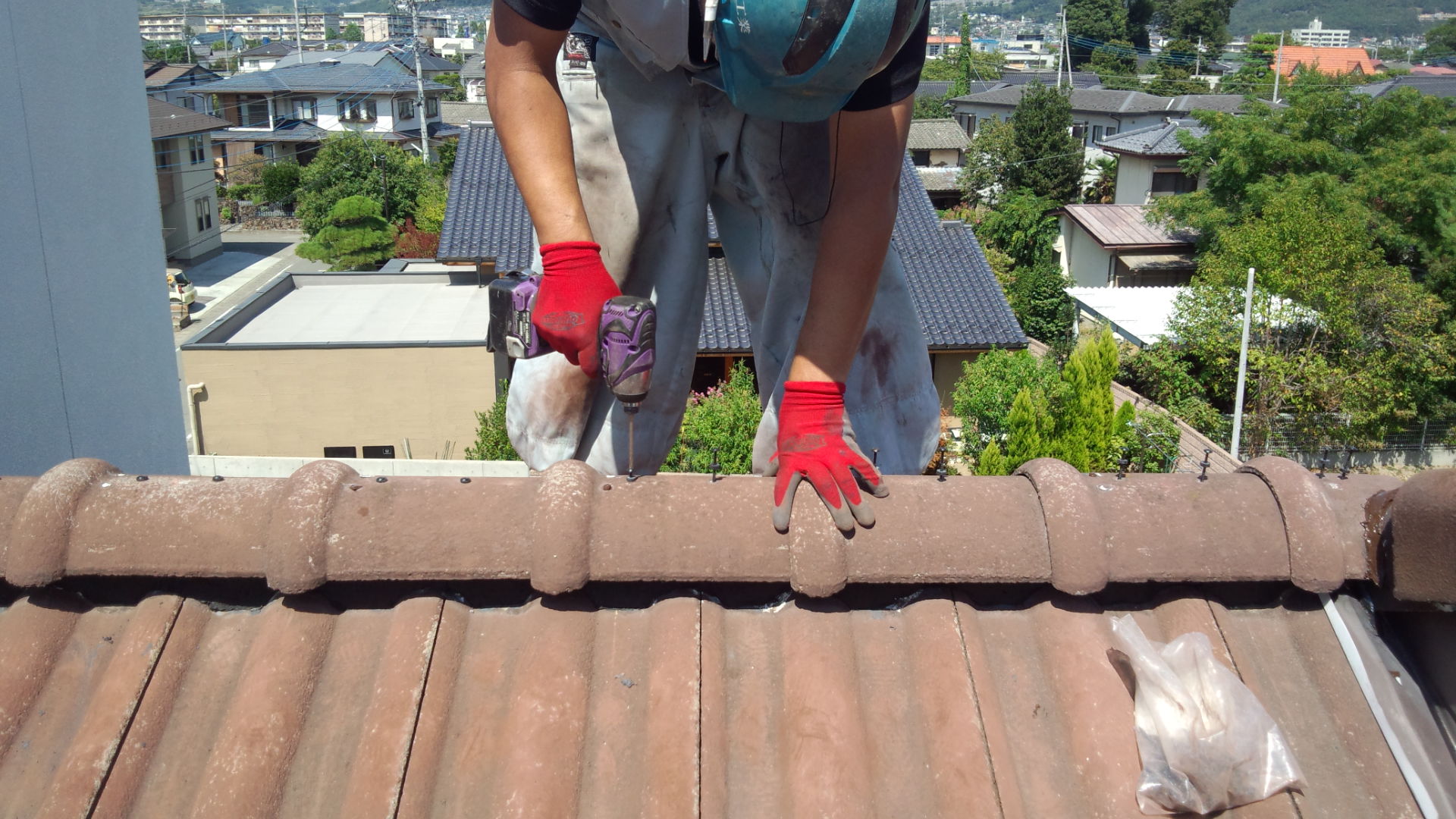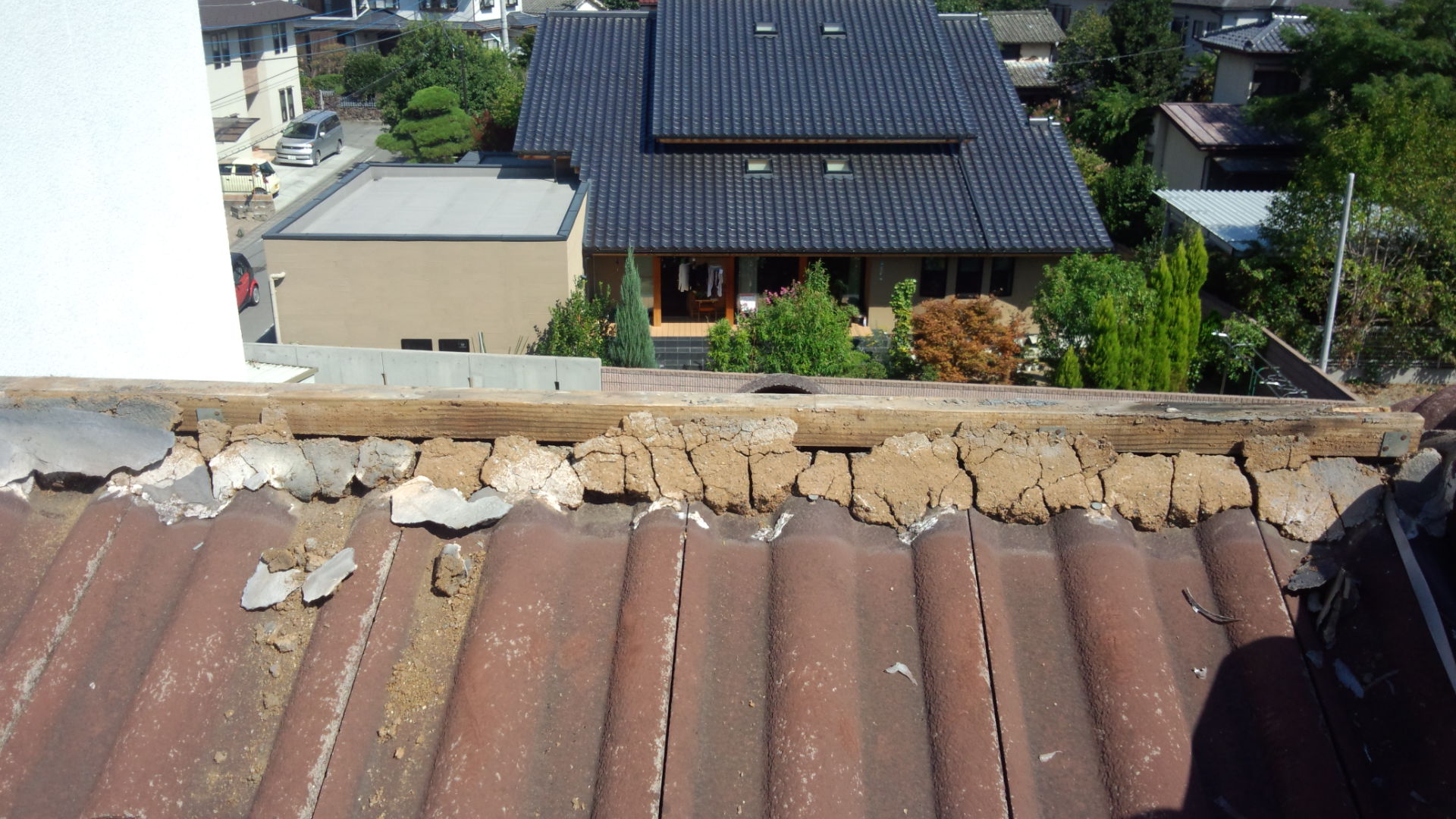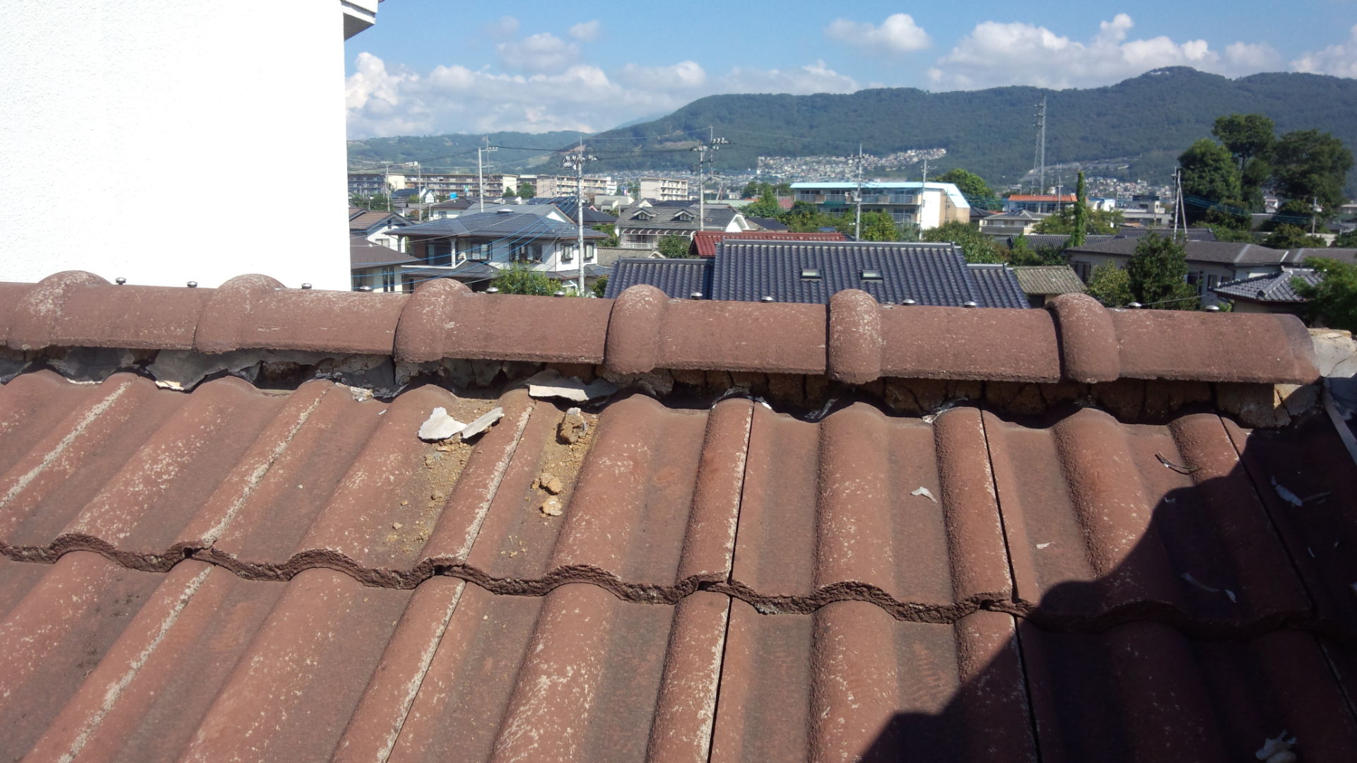 棟部分から漆喰やら土などが剥がれて落ちてきていました。
